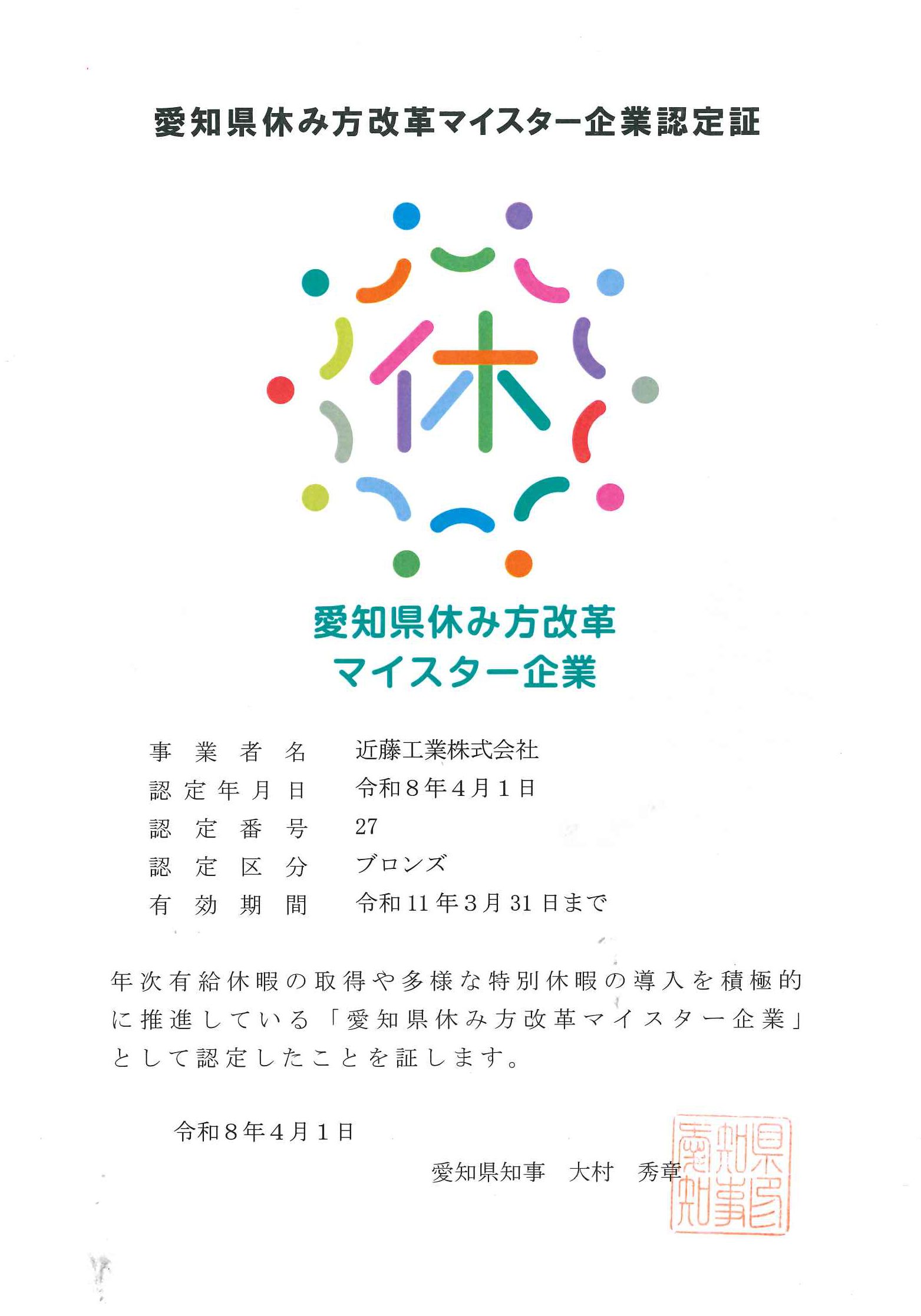 愛知県では、年次有給休暇の取得及び多様な特別休暇の導入を積極的に推進している中小企業等を奨励する企業に対して、愛知県休み方改革マイスター企業としての認定を行っており、2026年4月1日より愛知県休み方改革マイスター企業のブロンズ認定を受けました。